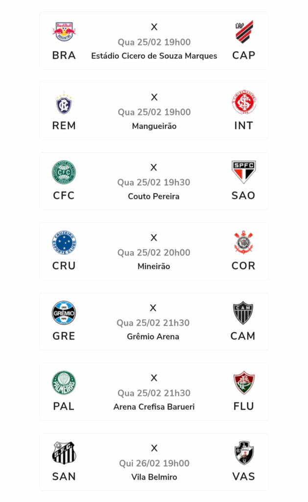 Além destas partidas, outras três agitam a quarta de futebol: Remo X Internacional jogam no Mangueirão, Coritiba X São Paulo se enfrentam no Couto Pereira e tem Bragantino X Athletico no Cícero de Souza Marques.